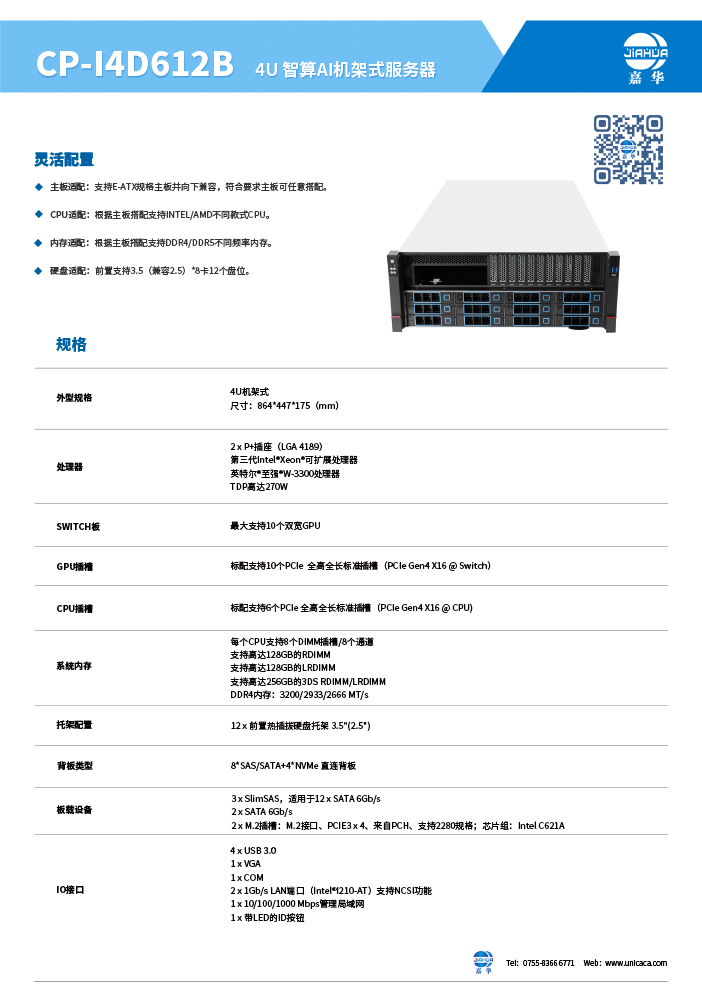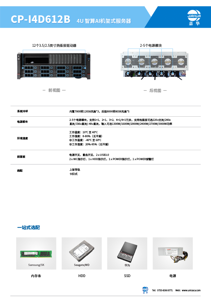 嘉华4U8卡智算服务器机箱,采用台湾中钢1.2mm优质SGCC生产,易开启锁扣上盖设计,支持8张双宽全高涡轮GPU卡,前置支持12个前置3.5"热插拔硬盘,兼容2.5"SSD。