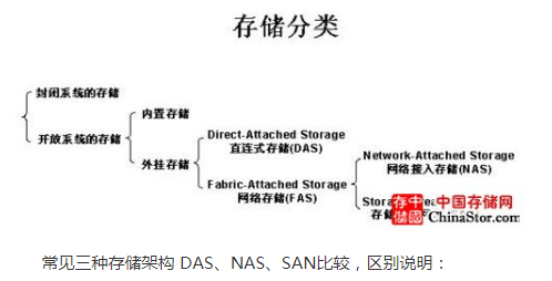 外挂存储根据连接的方式分为:直连式存储(Direct-Attached Storage,简称DAS)和网络化存储(Fabric-Attached Storage,简称FAS);网络化存储根据传输协议又分为:网络接入存储(Network-Attached Storage,简称NAS)和存储区域网络(Storage Area Network,简称SAN)。看下图,可以清晰的理解刚才的描述。
