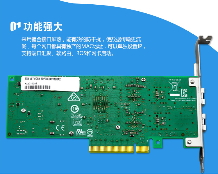 XXV710DA2在基于 XXL710DA2 芯片方案基础上而自主研发的一款PCI Express 3.0 * 8 以太网700系列网络适配器,此系列满足下一代数据中心的需求,提供了无与伦比的敏捷性能。灵活和可伸缩的25Gb速率网络,提供硬件的优化以及为云计算的智能卸载功能。支持网络虚拟化,网络虚拟化部署
