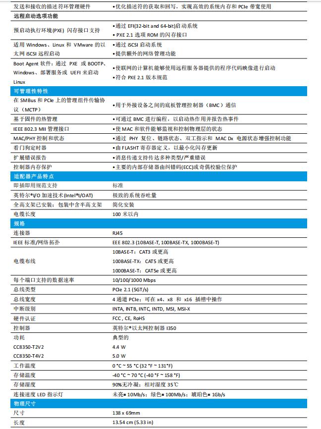 Ceacent CC8350-T4V2是深圳嘉华众力科技有限公司在基于INTEL I350芯片方案基础上自主研发的一款PCIEx4线程, 4* 1GBASE-T速率的RJ45接口,以太网服务器适配器(千兆网卡),支持自I/O 虚拟化与服务质量(QoS)功能,能高效的实现虚拟与非虚拟环境下的资源调度。