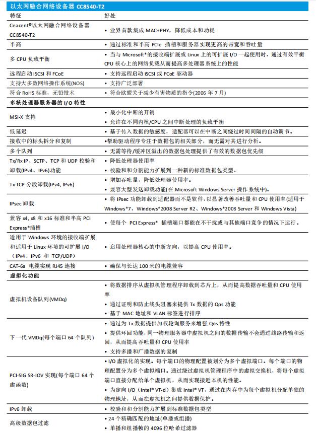 CC8540-T2是深圳嘉华众力科技有限公司在基于Intel X540芯片组方案上开发出的一款双电口万兆网卡,具备PCI-EX4插槽,支持Auto-Negotiation技术,自动侦测全双工/半双工方式,自动匹配网络传输速率,支持VLAN网络汇聚功能;