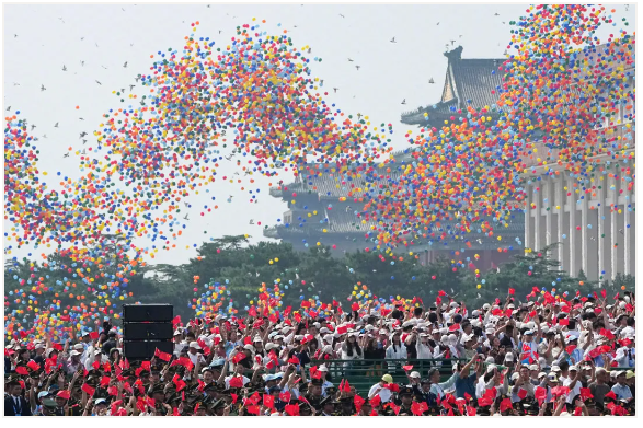 和平鸽展翅高飞,彩色气球腾空而起。嘉华总经理是一名老党员,他在活动结束后动情地表示:“爱国主义教育是企业文化建设的基石。组织员工观看阅兵式,有助于增强团队凝聚力和国家认同感。”