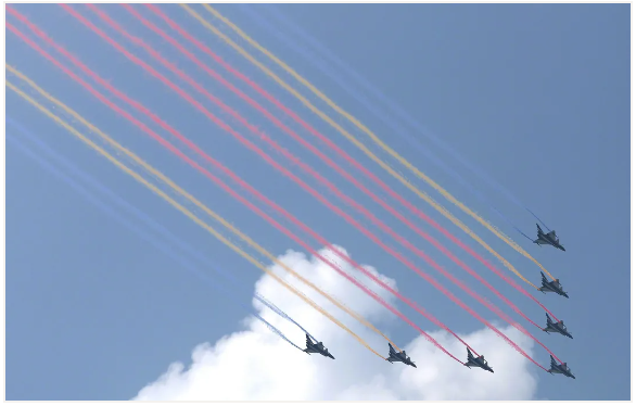 7架歼10表演机划过长空拉出的14道彩色烟带,寓意着中华民族14年可歌可泣的抗战历程,象征着14亿中国人民奔向强国复兴的绚丽前景。也在每个人心中刻下深深的爱国印记。
