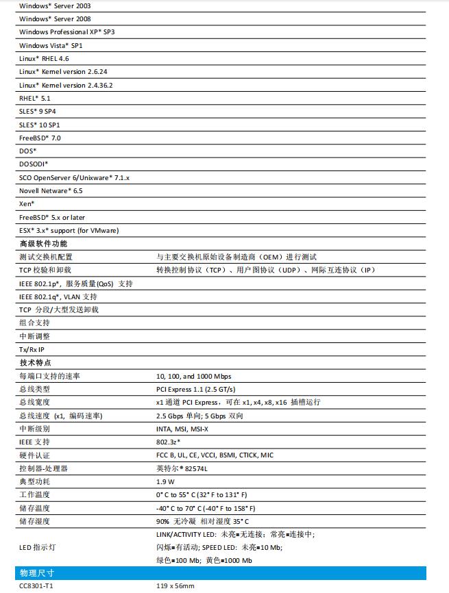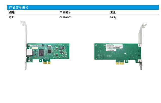 Ceacent CC8301-T1是深圳嘉华众力科技有限公司自主研发的一款PCIEx1线程, 1* RJ45铜端口 ,10/100/1000Mbps自适应传输特性的以太网服务器适配器(千兆网卡),